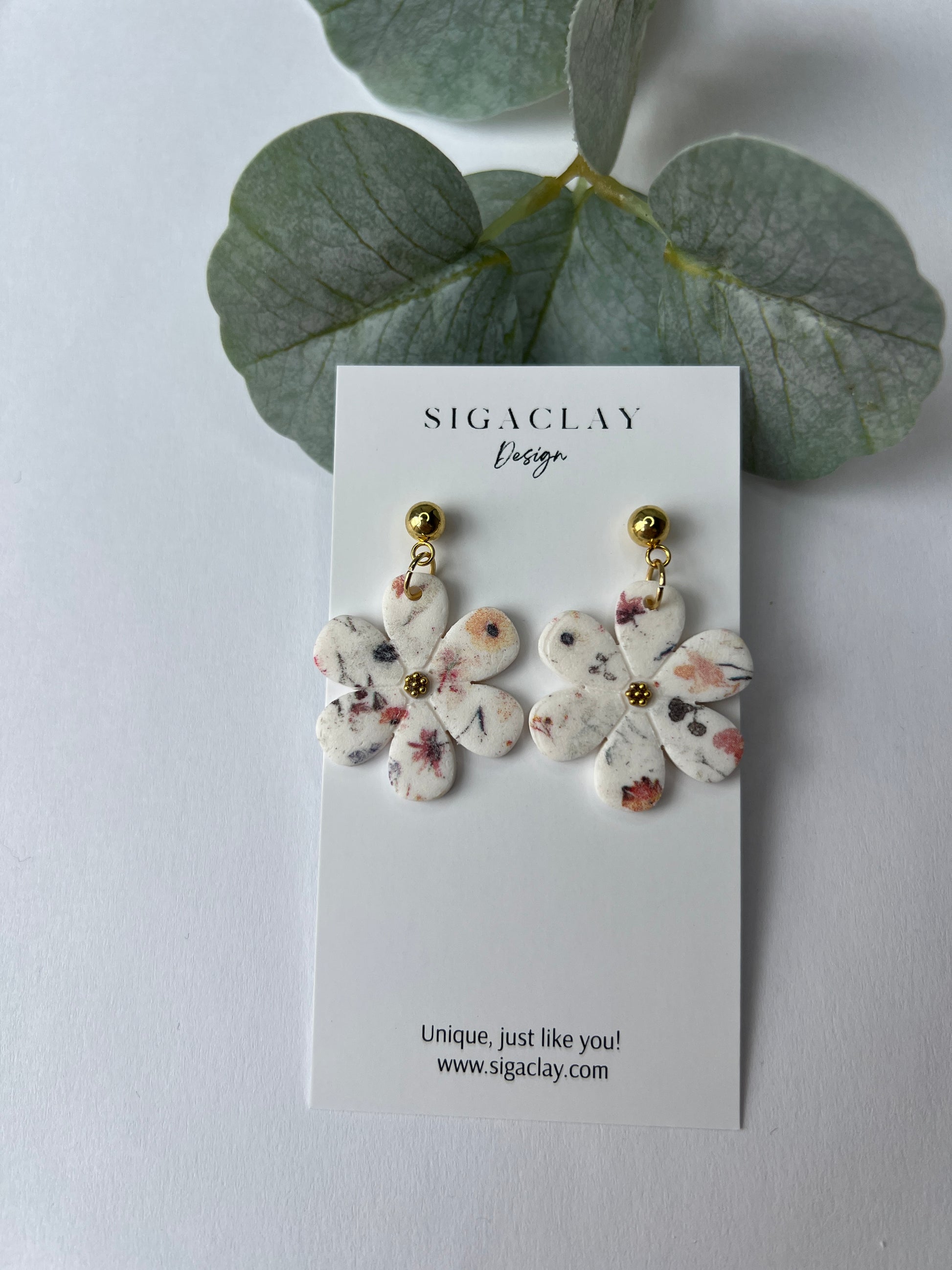 All Siga Clay earrings are handcrafted with polymer clay - we do ask that you handle them with care. Please do not place heavy items on your earrings or allow them to bend to avoid breakage. Please keep earrings away from oils and perfumes. Clean with water or mild soap with a damp clean cloth or soft brush. Store in a cool, dry area.