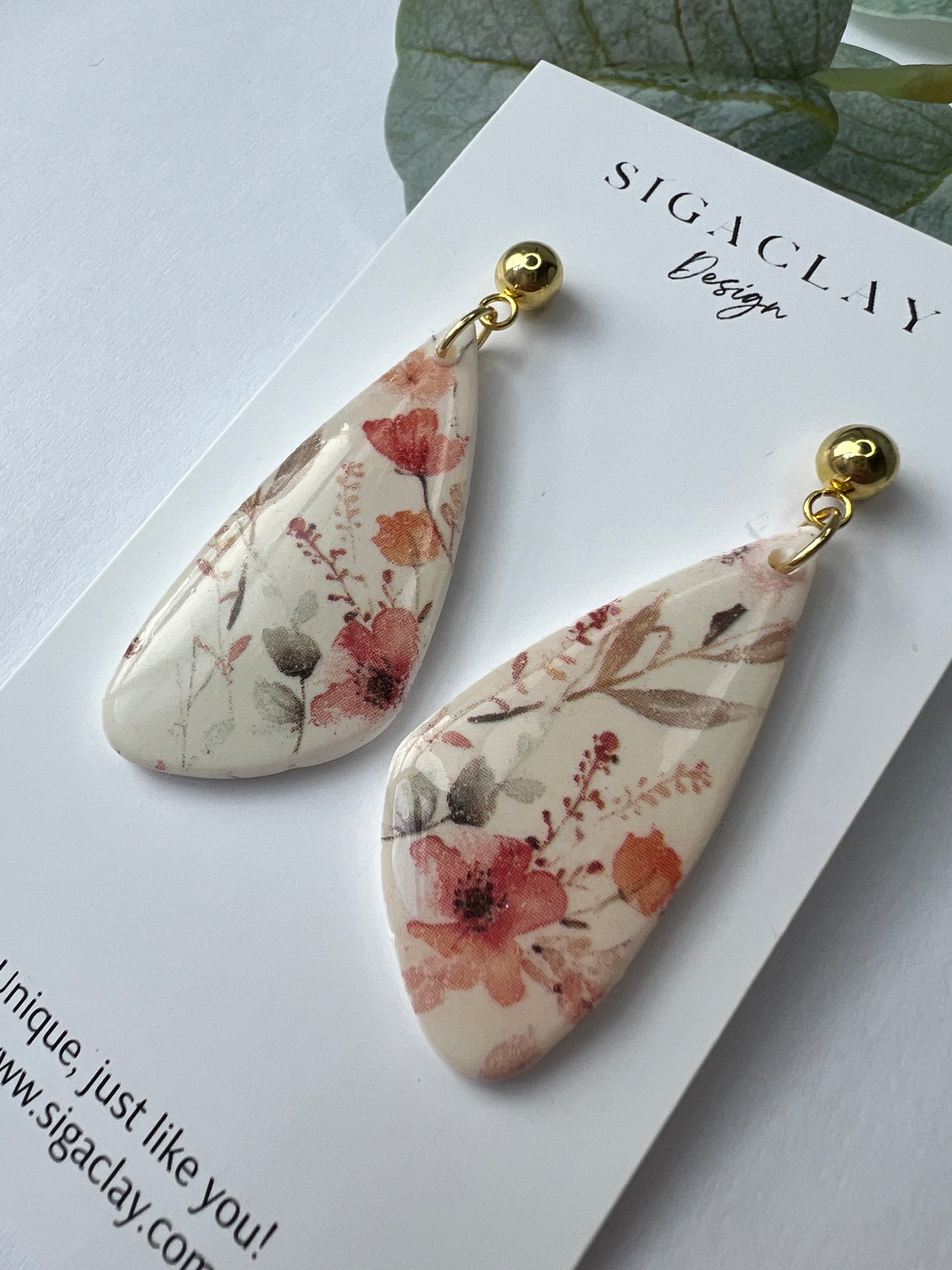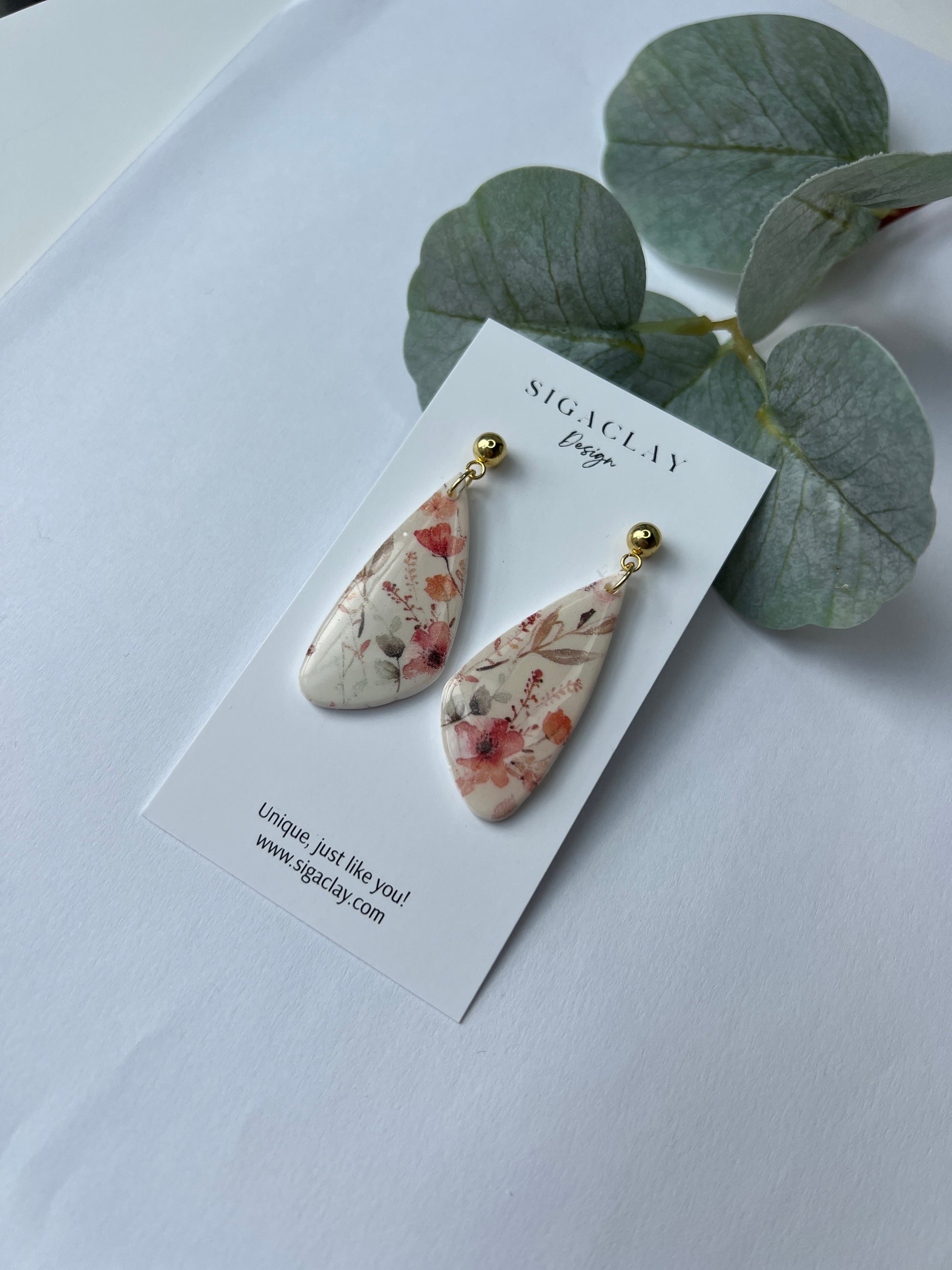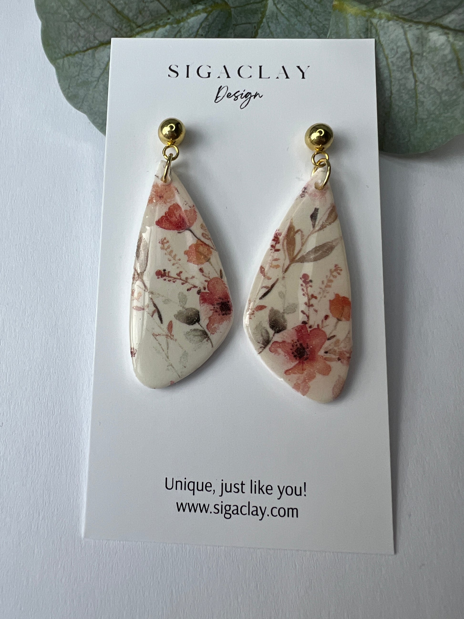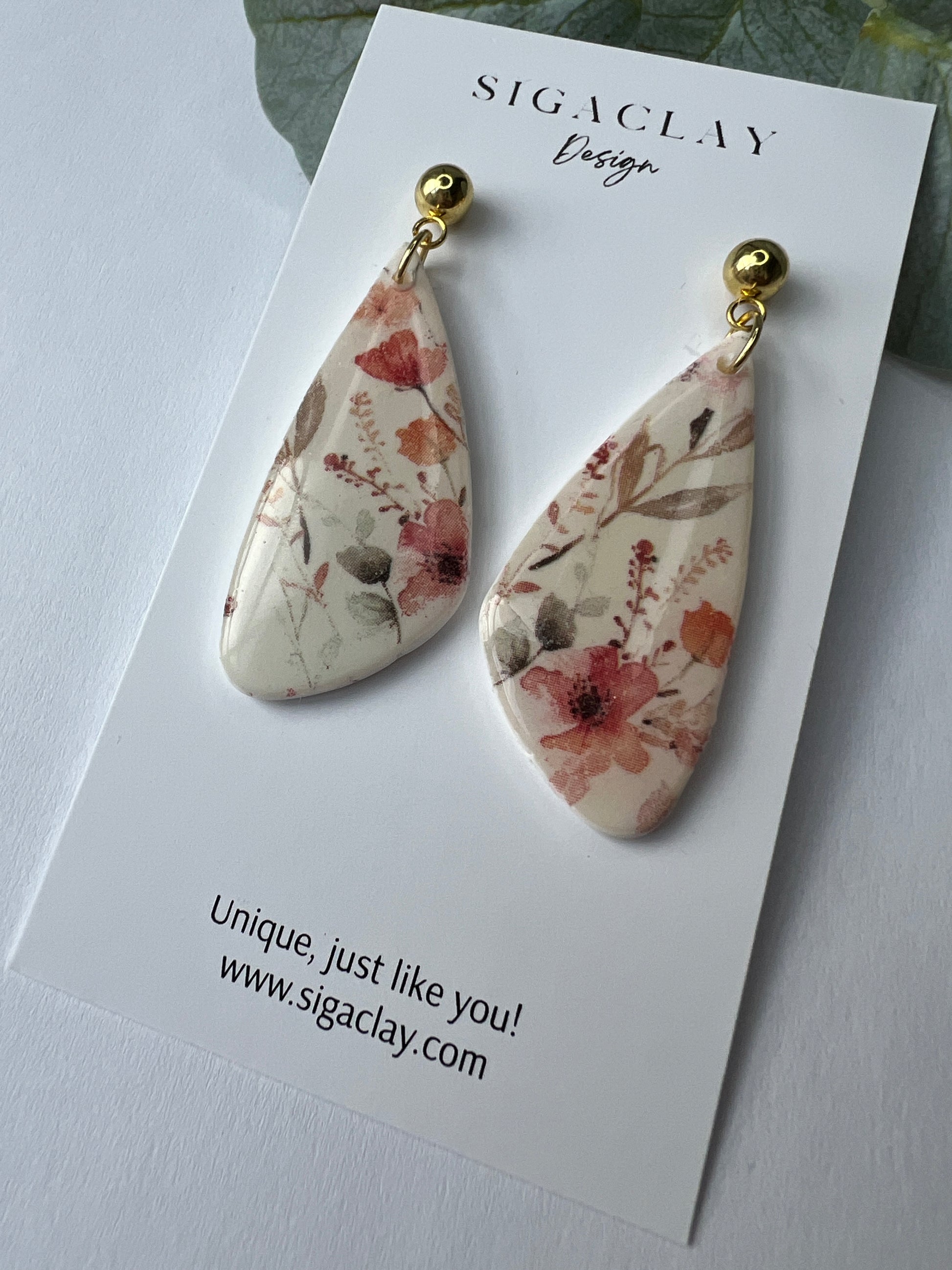 All Siga Clay earrings are handcrafted with polymer clay - we do ask that you handle them with care. Please do not place heavy items on your earrings or allow them to bend to avoid breakage. Please keep earrings away from oils and perfumes. Clean with water or mild soap with a damp clean cloth or soft brush. Store in a cool, dry area.